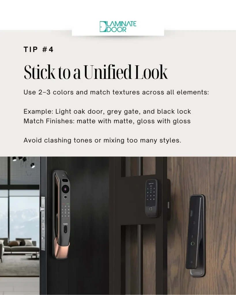 Consistency is key. Stick with 2–3 colors across your door, gate, and lock to avoid a cluttered appearance. For example, a light oak door with a grey gate and a black lock creates a harmonious look. Also, try to match textures—matte with matte, gloss with gloss—for visual consistency.